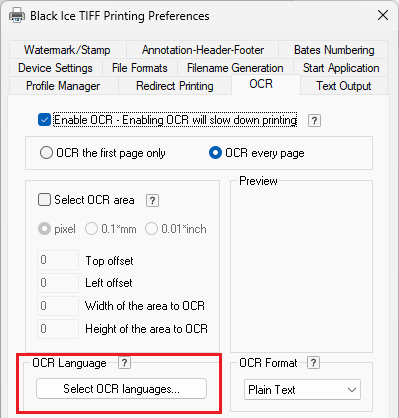 By default, only the English OCR language is available in Black Ice Printer Drivers. Additional languages must be downloaded before they can be used. To add more languages, download the OCR language pack by using one of the links below, then run the downloaded installer. For detailed installation instructions, see the Installing the OCR Language Pack for Printer Drivers section of the manual.