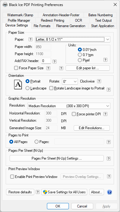 Under Device Settings tab, users can change paper sizes, orientation, resolution of the output documents and configure N-Up Settings.