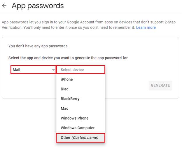 NOTE: To generate an App password, users have to enable 2-Step Verification in their Google account.