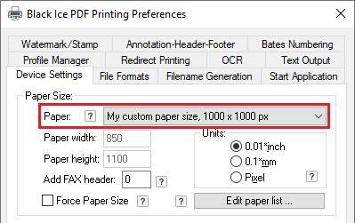 Before printing the document, make sure that the newly created paper size is selected on the Device settings tab.