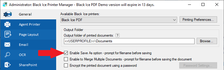 When the Enable Save As option is selected, the Save As dialog is displayed each time before printing the file. The Black Ice Save As dialog is very similar to the regular Windows Save As dialog, except that the previous one contains additional Black Ice options.