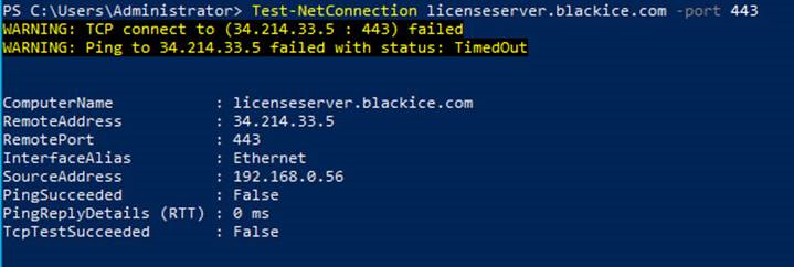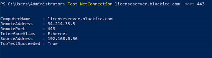 On the PS prompt, please type in “Test-NetConnection licenseserver.blackice.com -port 443” as shown below.