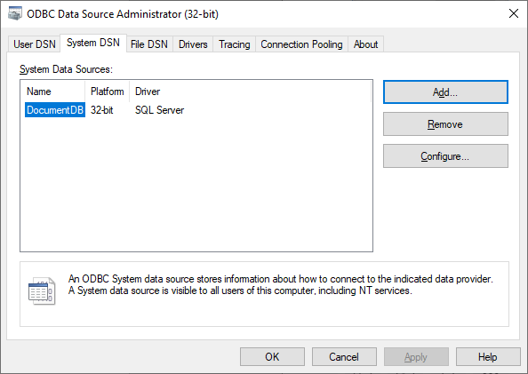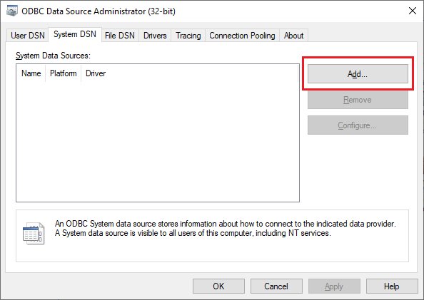 The ODBC Data Source Administrator window opens. Go to System DSN tab, and Click on the Add button to add a new ODBC connection.