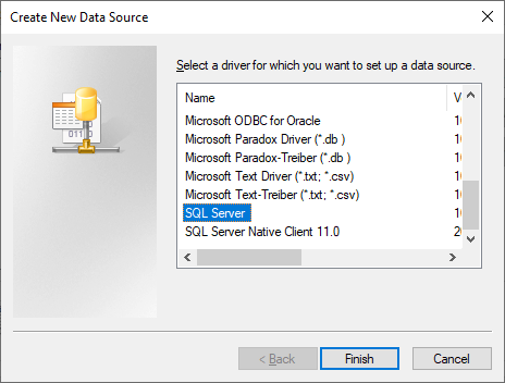 Select the Data Source driver. In most cases it is the SQL Server. Click on the Finish button to continue.