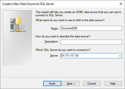 Enter a display name for the ODBC connection, and enter the remote database server IP address or domain name. Click on the Next button to continue.