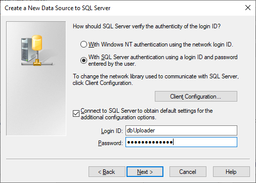 Select the preferred authentication mode. In most cases, it’s SQL Server authentication. Enter the Login ID and Password for the remote database. The entered user must have read/write access to the remote database. Click on the Next button to continue.