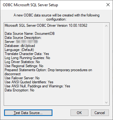 Review the summary page if all settings are correct. One can test the connection by clicking on the Test Data Source button. Click on the OK button to finish adding the ODBC connection.