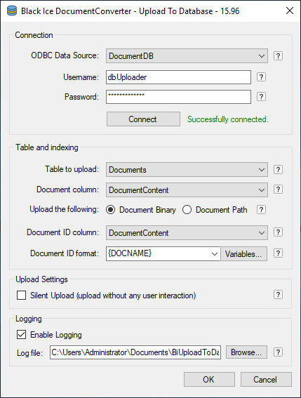 Next time when starting the Print and Save Documents to Database feature of the Printer Driver, the new ODBC connection will be available in the ODBC Data Source list. For detailed information about how to configure the Print and Save Documents to Database utility, please refer to the following page.