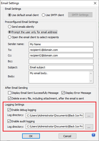 NOTE: The Black Ice Printer Driver is not checking if the specified destination email addresses are exists or not. If the destination email address is not specified correctly, but the SMTP Settings are correct, the Printer Driver tries to send the email and writes ‘E-mail has been sent’ message in the log file.