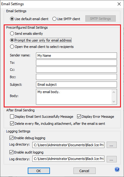 If the Send emails silently option is enabled, users can preconfigure the email preferences including the Sender name, To, Cc, Bcc, Subject and Body, which results silent email sending without any user interaction. If the user prints to the Black Ice Printer Driver will send the email in the background.