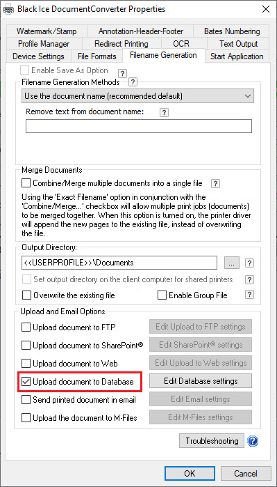 One can enable the Upload document to Database feature in Document Converter Service Manager > Printing Preferences > Filename Generation Tab > Upload document to Database.