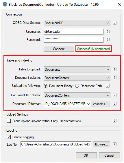 The Document Converter Printer Drivers have a built-in feature to upload the converted documents to a database through an ODBC connection. This feature is available from version 1.70 in Document Converter Server.