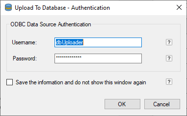 If Silent Upload is unchecked (disabled), the Upload to Database feature displays the following window; one can specify the username and password for the configured ODBC Data Source.