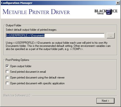 Next, the installer will provide the option to set the output folder and several post-printing options. Environment variables can be used to apply global output directory settings with user-specific folders. Select your desired settings, then click OK: