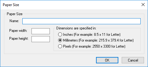 Enter the name of the paper. This name appears in the paper sizes combo box. Specify the width and the height of the paper. The numbers entered as paper width and paper height can be specified using different units: 0.01 inches, 0.1 millimeters or pixels.