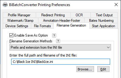 One can configure a Black Ice Printer Driver INI file which specifies the output directory where to save the generated documents. In order to use the output folder from an INI file, select the Use the document name with the output directory from the INI file option, browse an INI file. The INI file must contain the following information: