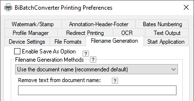 The ‘Remove text from document name’ feature allows one to remove characters from the document name. Many applications like Microsoft office or Cristal Report place a prefix front of the document name. For example a Crystal Report document name start with “Crystal Reports - ABC - (CC_Code39_S3)” but the user only wants “ABC - (CC_Code39_S3)”.