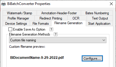 Custom file name scheme can be built using the Custom File Name utility. A preview shows the selected custom file naming scheme if the output contains multiple files. If the result of the document conversion is a single output file, for example, PDF file, the filename follows the first line of the example. Press Configure… to modify settings. To use custom file naming scheme, disable the Enable Save As Option. For more information, please see the Custom File Name Configuration section.