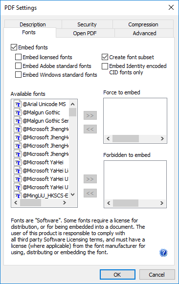 Create font subset - When embedding fonts, it is possible to include only those characters in a font that are used in the document. This partial font is called a Font Subset. If this option is checked, fonts are embedded as font subset. This works only for TrueType/OpenType fonts. This setting can greatly reduce the output file size.