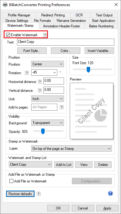 To configure the Printer Driver to add a custom text watermark/stamp to a printed document, please navigate to the Printing Preferences > Watermark/Stamp tab, and check the Enable Watermark option.