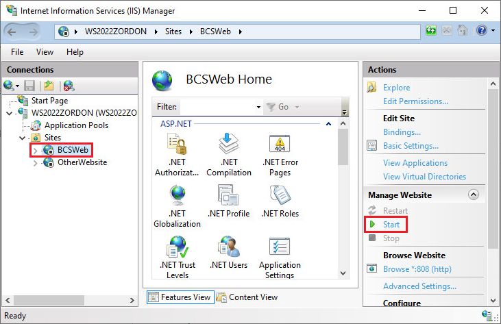 Once the website has been stopped, select the BiBatchConverter Server Web Interface website, and click on Start.
