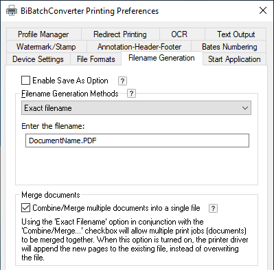 Using the Exact Filename or the Use the document name option in conjunction with the Combine/Merge… checkbox allows multiple print jobs (documents) to be merged together. When this option is turned on, the printer driver merges the new pages to the existing file instead of overwriting the file.