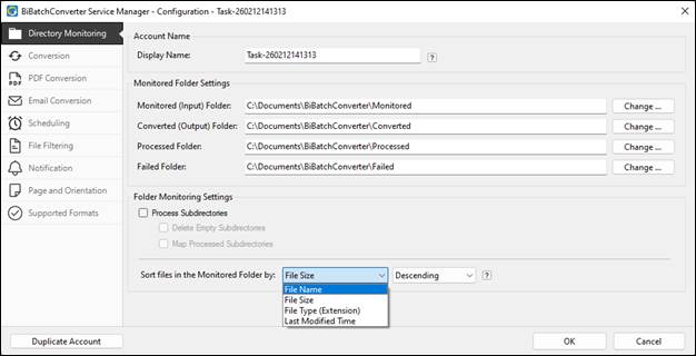 Sort the files in the Monitored Folder before processing. Sorting does not affect files added during conversion; it only affects files when the conversion starts.