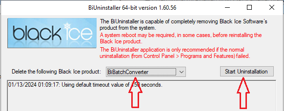 Please start the BiUninstaller utility, select the BiBatchConverter, and click on the "Start Uninstallation" button.