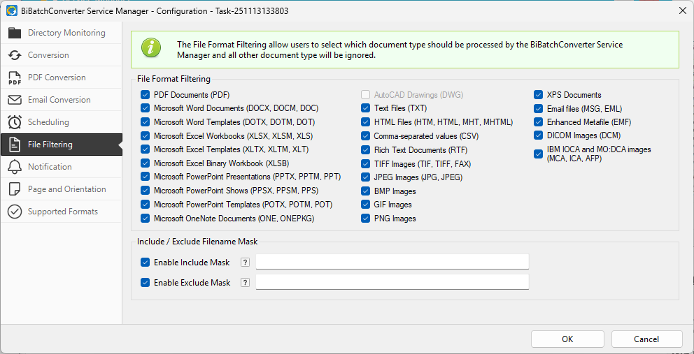 The File Filtering with Include and Exclude Mask feature lets you control which files are processed and which are skipped in the BiBatchConverter conversion service by each conversion task.