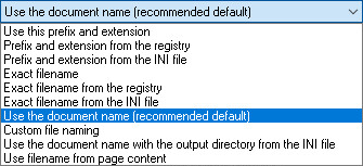 The filename and the prefix will be read from the specified .INI file. The driver searches in the .INI file for a section with the printer name. Use the File Name Prefix key for the file prefix and the File Name extension key for the extension.