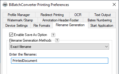 If Exact filename is selected, and a filename with extension is provided, (for example, testfile.jpg) the printed document is named with the .jpg extension and the settings under the File Formats tab are ignored.
