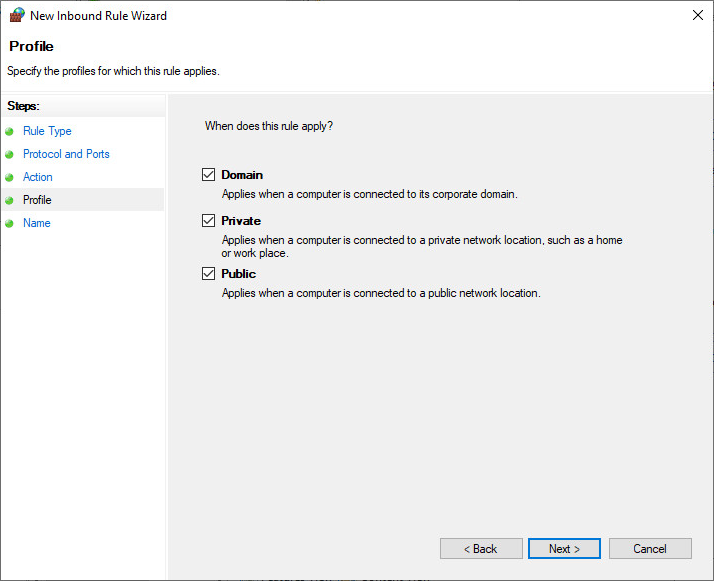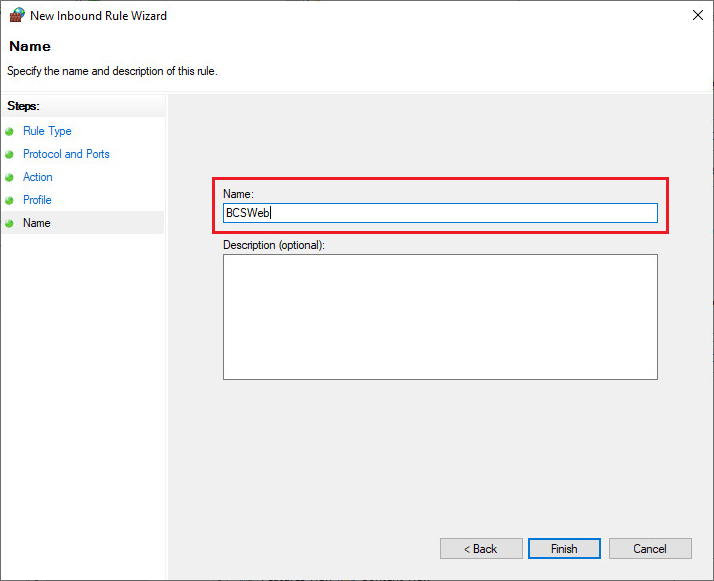 To enable the website through the Firewall, go to Control Panel > Windows Defender Firewall > Advanced Settings > Inbound Rules > New Ruleā¦