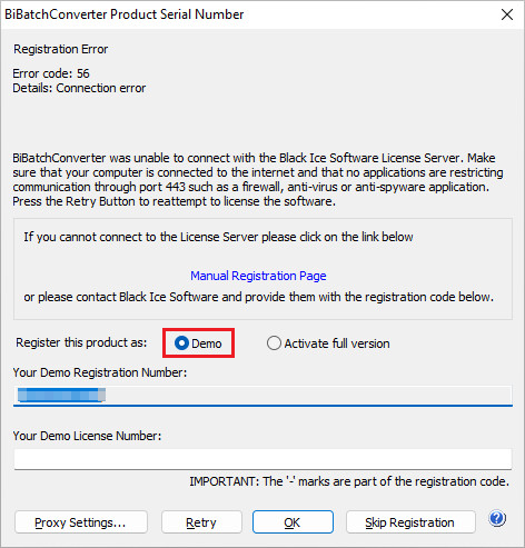 If registering the BiBatchConverter Server Demo fails during installation and BiBatchConverter Server is installed without registration, one can register the BiBatchConverter Server manually without an active internet connection by following the instructions below.