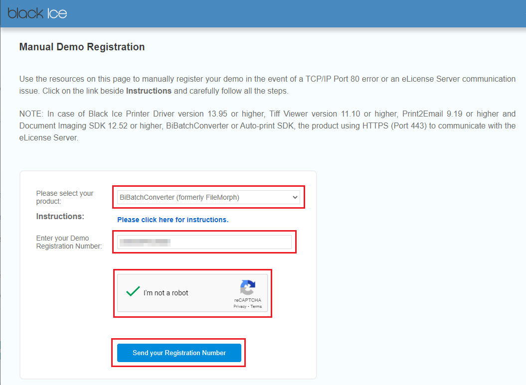 To receive a Demo License Number immediately, please copy the Demo Registration Number from the registration window, navigate to the Manual Demo Registration webpage, select the BiBatchConverter from the Choose your product dropdown list, and paste the Demo Registration Number to the Enter your Demo Registration Number field. Please check the captcha checkbox and click on the Send your Registration Number button.