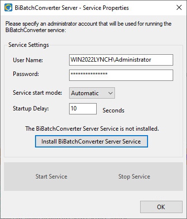 Enter the Local Administrator credentials, and click on the Install BiBatchConverter Server Service button.