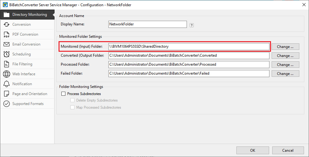 On the Directory Monitoring tab of the appearing Configuration window, please enter the UNC Path (for example: \\BIVM1064PS5SSD\SharedDirectory) to the Monitored (Input) folder.