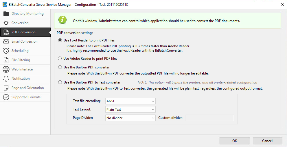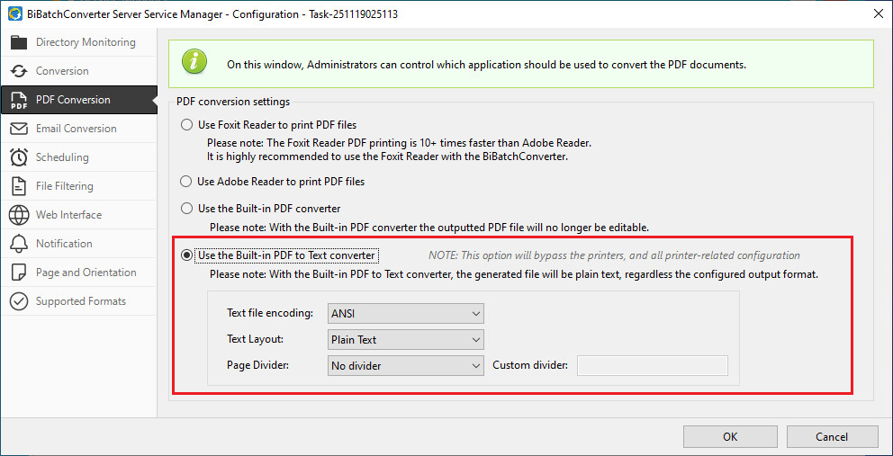 The Use the Built-in PDF to Text converter option enables BiBatchConverter to extract text directly from PDF documents without relying on Adobe Reader or Foxit Reader. When the Use the Built-in PDF to Text converter option is selected, the BiBatchConverter Service bypasses the printer and all printer-related configuration settings. The generated output will always be a plain text file, regardless of the configured output format on the Conversion tab.