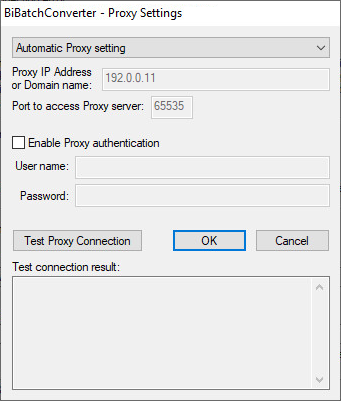 If the Proxy server is using user authentication, the Proxy authentication checkbox must be checked and the User name and Password must be specified.