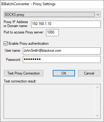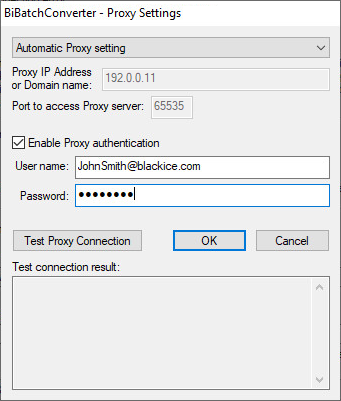After entering the IP Address/Domain Name, Port, and possible Authentication Credentials to access the Proxy Server desired to use, click the Test Proxy Connection button to test the connection through the Proxy Server towards the Black Ice License Server.