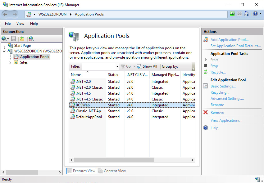 Please open the Internet Information Services (IIS), and see if the Application Pool has been installed and started under Application Pools.