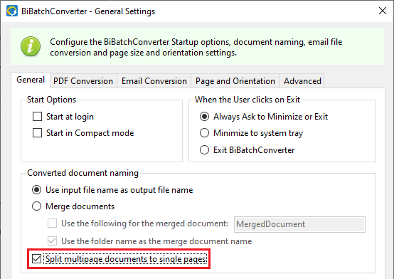 The General Settings window appears. Please enable the “Split multipage documents to single pages” option on the General Settings tab.