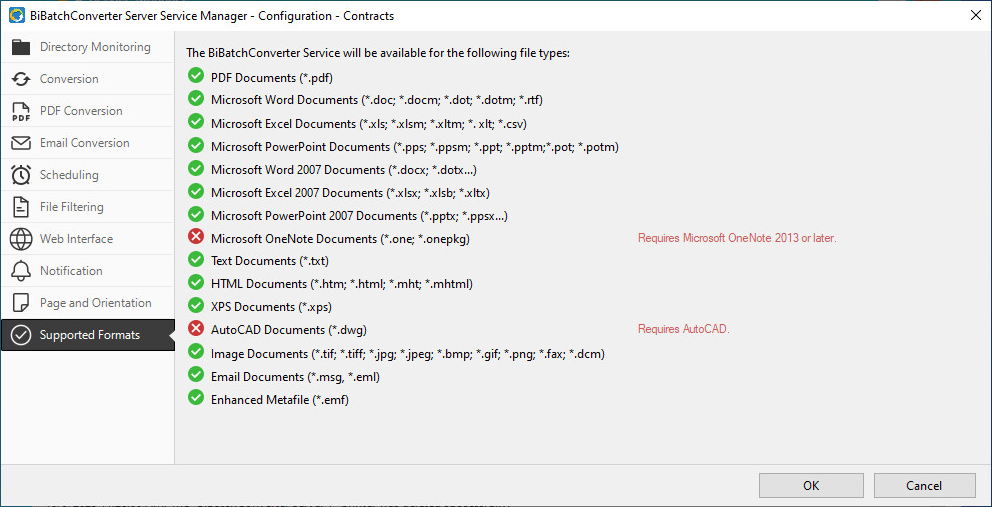 To review the detected applications for the supported file formats, navigate to Configuration > Supported Formats tab. The BiBatchConverter Server Service will be able to convert the file formats marked with green.