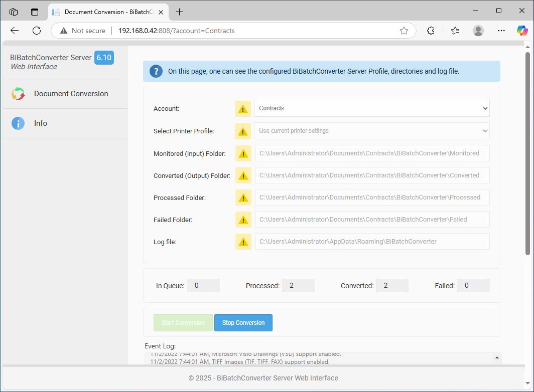 The BiBatchConverter Server Web Interface can be used to supervise and manage the document conversion remotely from any web browser.