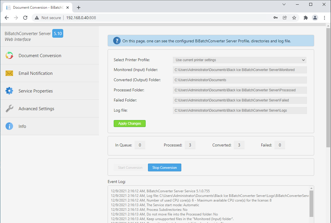 Before accessing the Web Interface, please first open and close the BiBatchConverter Server Service Manager at least once to create the set of default settings and to be able to modify the settings on the Web Interface. |