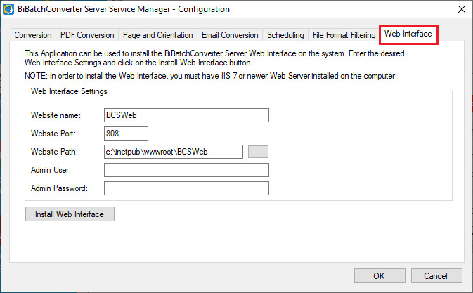 To install the BiBatchConverter Server Web interface, please navigate to the BiBatchConverter Server Service Manager > Configuration > Web Interface tab.