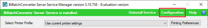 The BiBatchConverter Server Service Manager has an Configuration option to configure the Service settings.