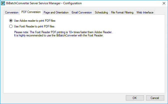 Under the PDF Converter Settings tab users and administrators can select which application to use for PDF printing. The BiBatchConverter Service supports Adobe Reader 10 or higher, Adobe Acrobat Pro 10 or higher and Foxit Reader 9.6 or higher.