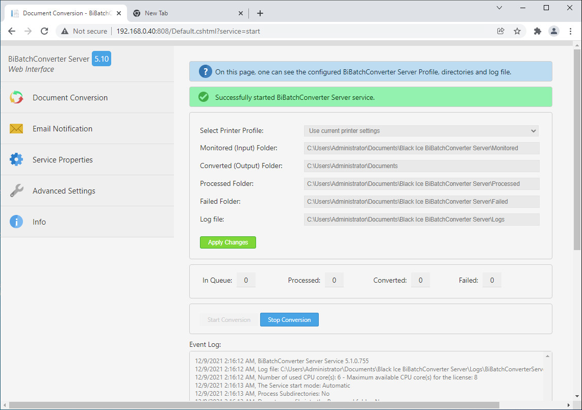 The BiBatchConverter Server Web Interface can be used to supervise and manage the document conversion remotely from any web browser.