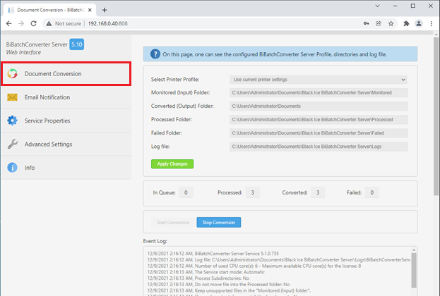 On the Document Conversion page, one can review the basic settings of the BiBatchConverter Service and the state of the document conversion. One can see the selected Printer Profile, remaining/processed/converted/failed documents, and review the BiBatchConverter Server log file in the Event Log section.
