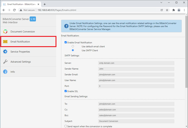On the Email Notification page, one can review the currently used email notification settings of the BiBatchConverter Server Service.